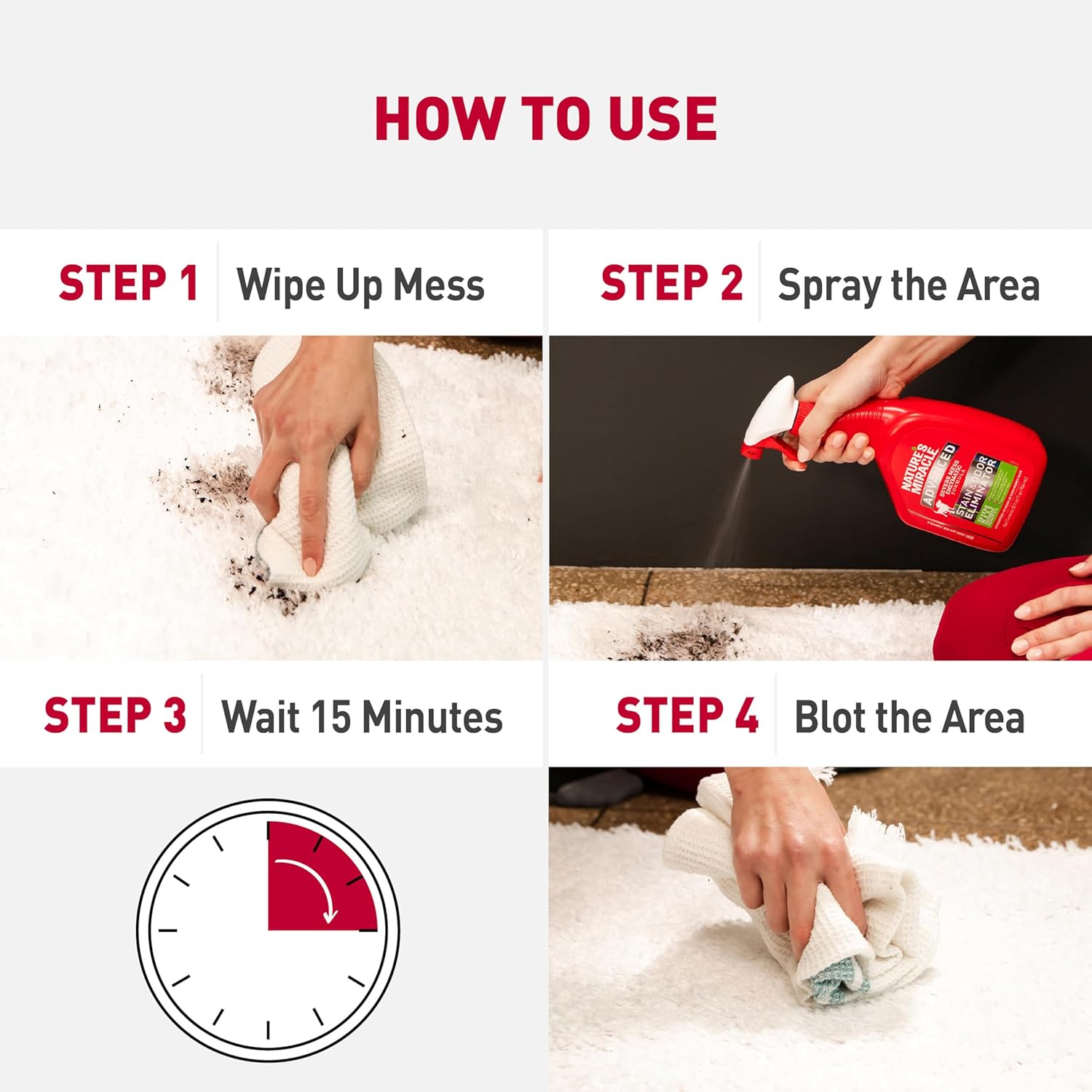 Based on product specifications, this advanced stain remover is designed for heavy-duty application. When applied to fresh dog urine and vomit stains, the liquid needs to thoroughly soak the affected area. According to Nature’s Miracle, you must let it air dry naturally, which can take several days depending on humidity and carpet thickness.