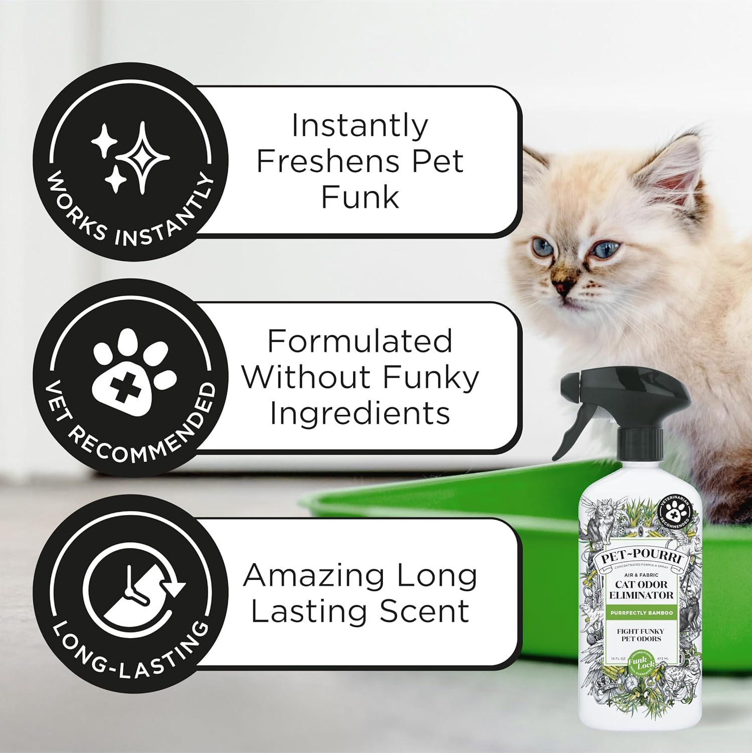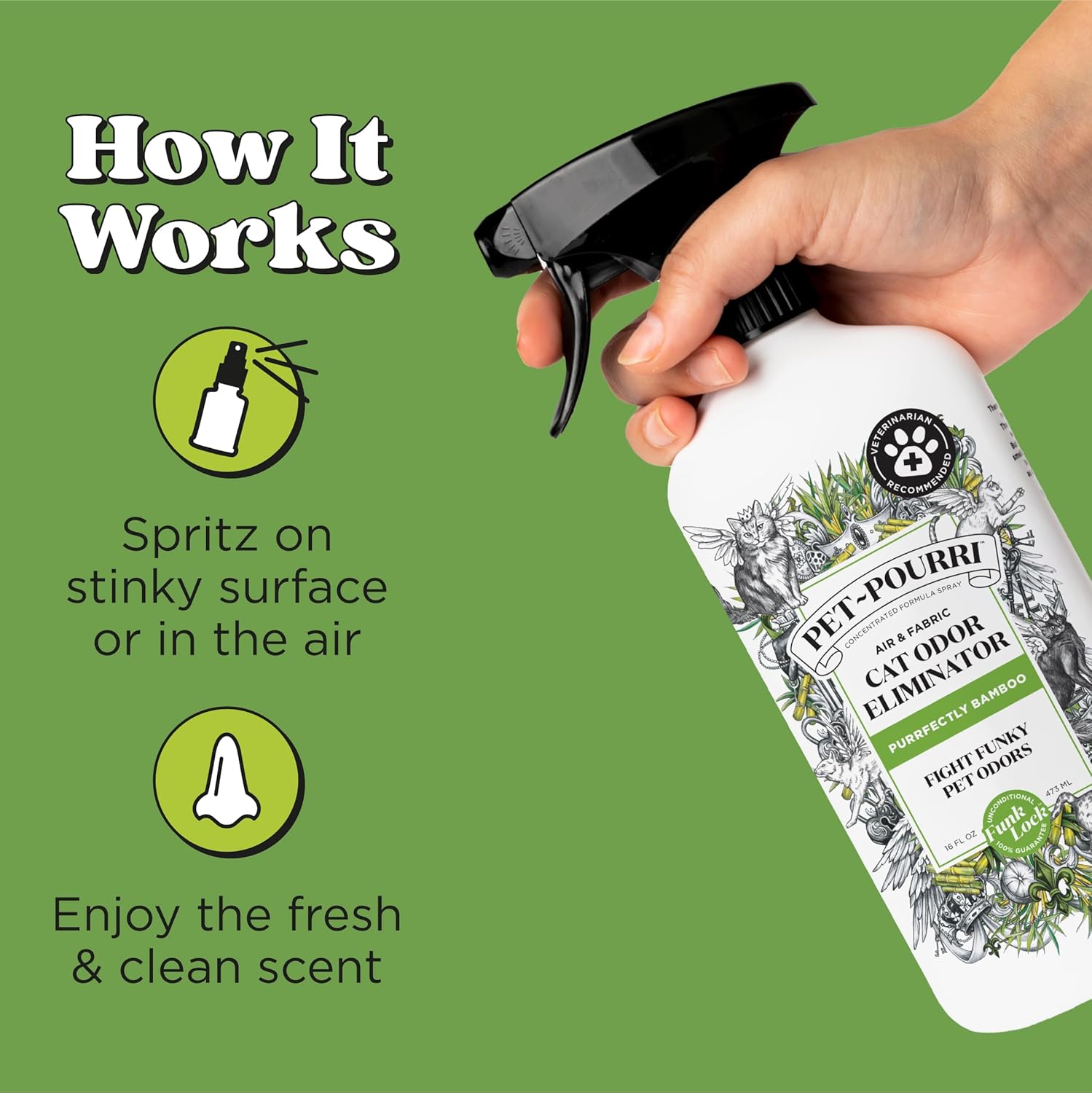 Say goodbye to stubborn litter box smells with the Pet-Pourri Smell Ya Litter Deodorizer Spray by Poo-Pourri. This vet-recommended, plant-based spray instantly neutralizes tough urine odors using proprietary Funk Lock Technology, leaving behind a calming Bergamot and Bamboo scent. Safe for your feline friends and multi-purpose by design, you can spritz it directly into the litter box, the air, or onto carpets and furniture to eliminate funk. Free from harsh chemicals, sulfates, and parabens, it is the perfect, long-lasting solution to keep your entire home smelling fresh and inviting!